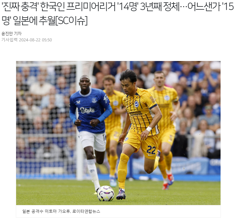 根据韩国媒体《朝鲜体育》的统计,随着镰田大地和菅原由势在英超效力,日本球员效力英超的人次超过韩国,这也让韩国方面感到担忧,毕竟英超赛场3年没有新增韩国球员,而9年前韩国球员还以13-7领先。