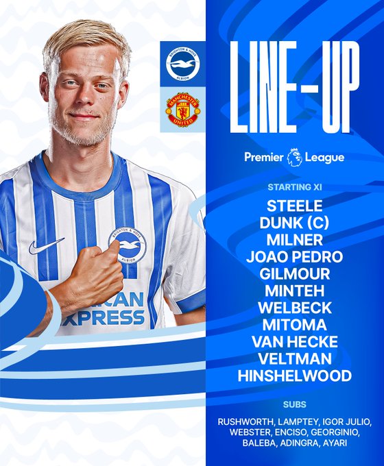 北京时间8月24日,英超第二轮,曼联客场挑战布莱顿。赛前两队公布首发名单: