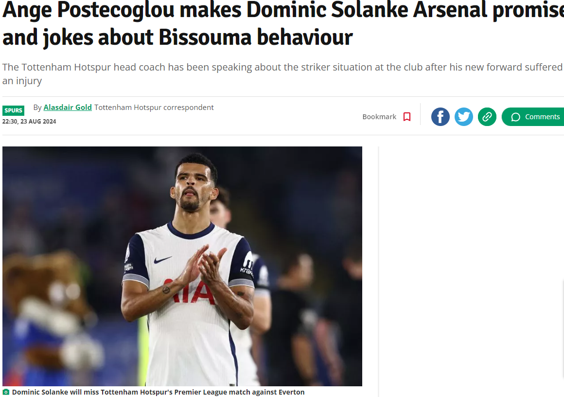 英超第2轮热刺主场和埃弗顿的赛前新闻发布会上,热刺主帅波斯特科格鲁确认新援索兰克将因伤缺席,此外本坦库尔很可能缺席,但比苏马有望出战。