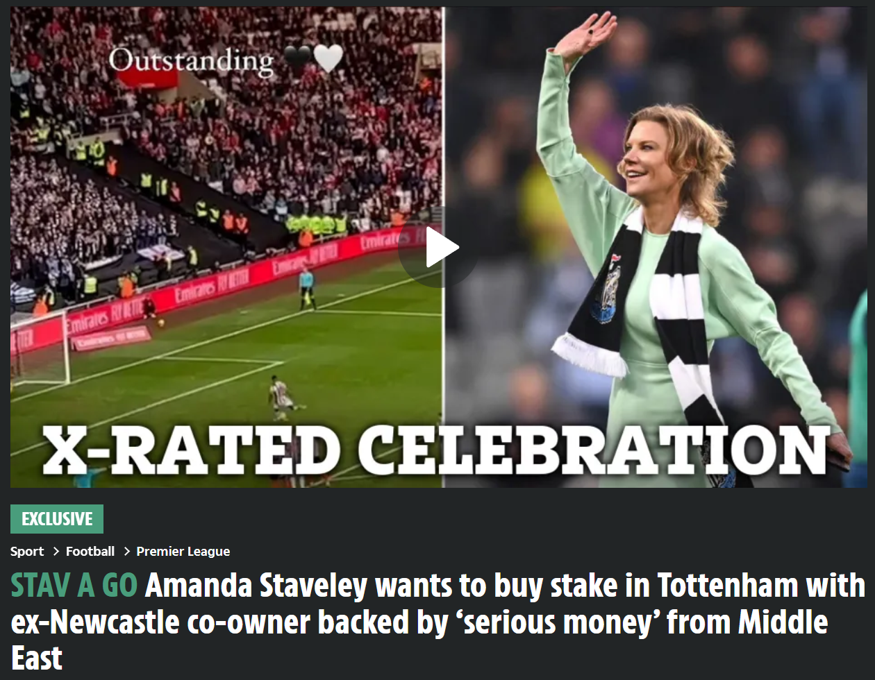 英国《太阳报》介绍,纽卡斯尔小股东阿曼达-斯塔维利(Amanda Staveley)得到了中东的“大笔资金”支持,正在加紧收购托特纳姆热刺的部分股份。