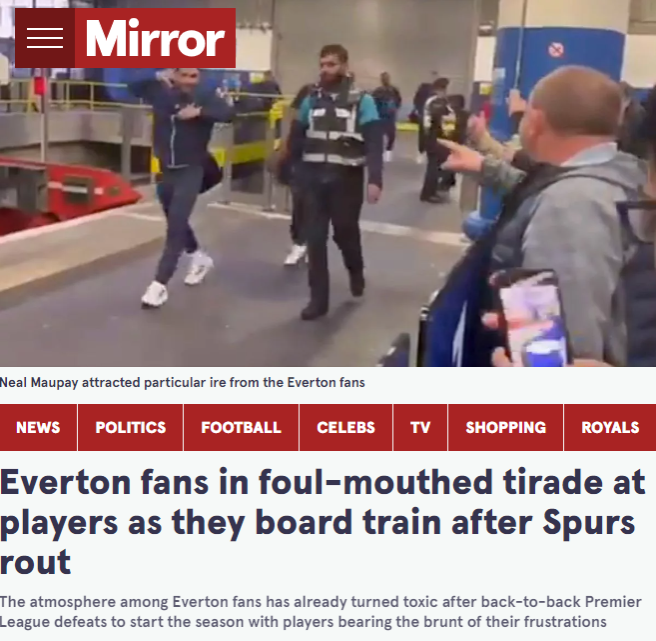 埃弗顿首轮英超0-3不敌布莱顿,第2轮做客面对热刺则是0-4惨败,遭遇2连败之后垫底。输给热刺之后,埃弗顿球员前往伦敦火车站乘车返回利物浦,然而当球员抵达火车站时却遭遇激进球迷的围堵。