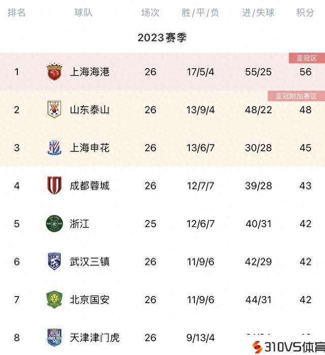 中超积分榜:海港8分优势领跑,泰山申花蓉城2-4位,南通深圳升级区