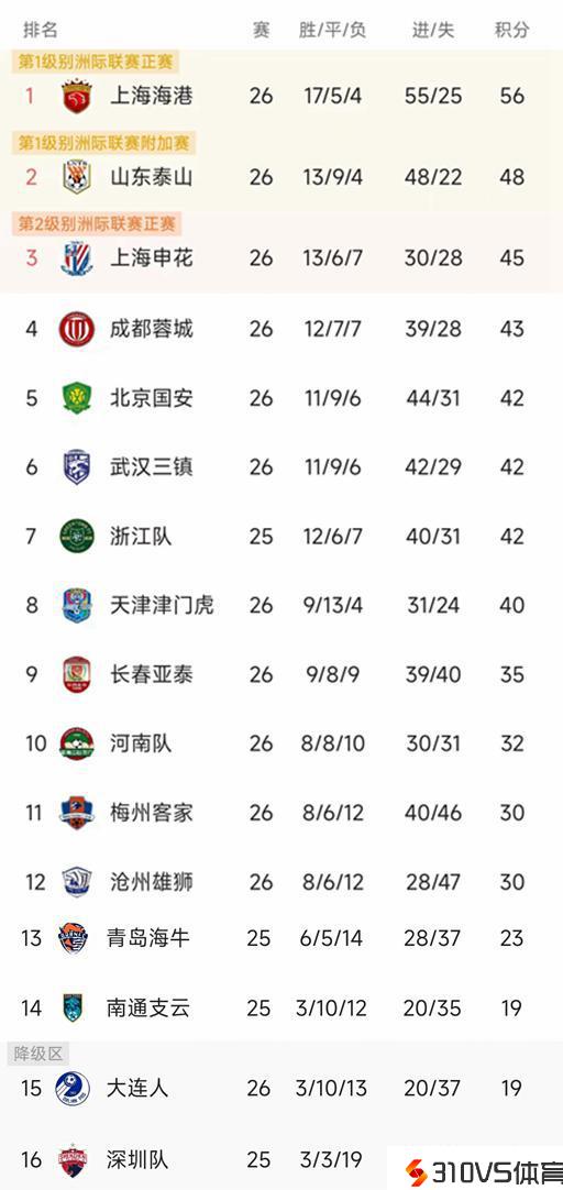 中超最新积分榜