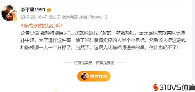媒体人李平康表示,公告外面说“数额特别庞大”,他了解的一笔数额是金元足球末期某队为了想递补进入中超,给了事先掌握实权的人半个小目的,然后该人把这笔钱和陈戌源一人一半分掉了。