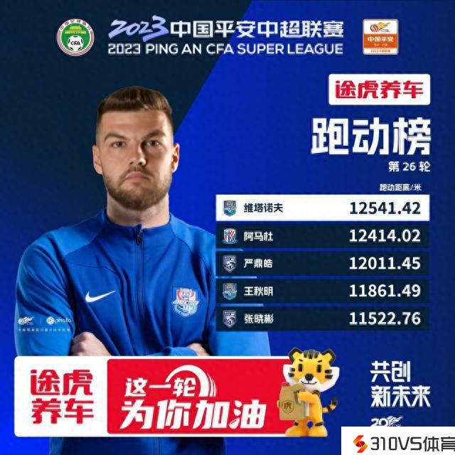 中超第26轮跑动榜:维塔诺夫居首,津门虎、三镇各2人进入前五