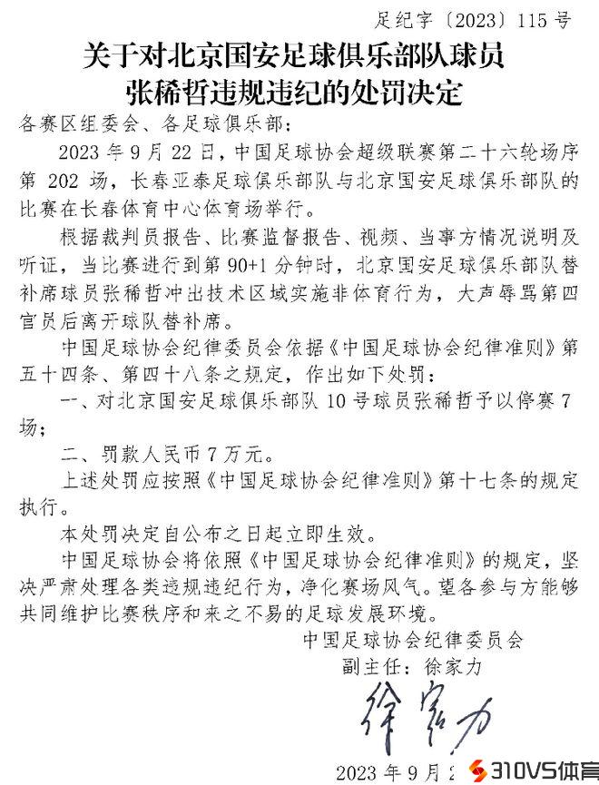 足协开重磅罚单,张稀哲停赛7场+罚款7万,北京国安回应