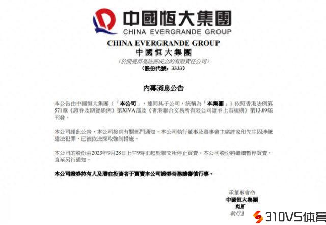恒大集团在公告中表示:本公司接到有关部门通知,公司执行者董事及董事会主席许家印涉嫌违法立功,已被依法采取强迫措施。本公司的股份由2023年9月28日上午9时正起于联交所中止买卖。本公司股份将继续暂停买卖,直至另行通知。