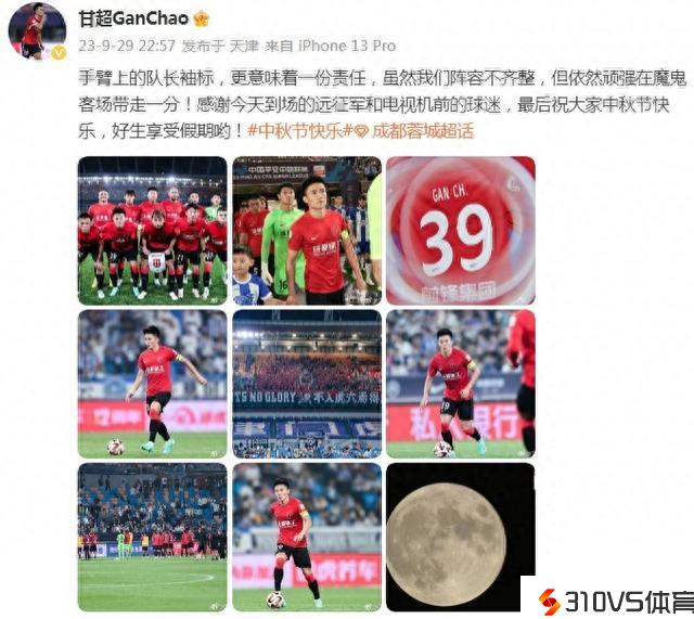 甘超社媒:队长袖标意味着责任 虽阵容不整但在魔鬼客场带走一分