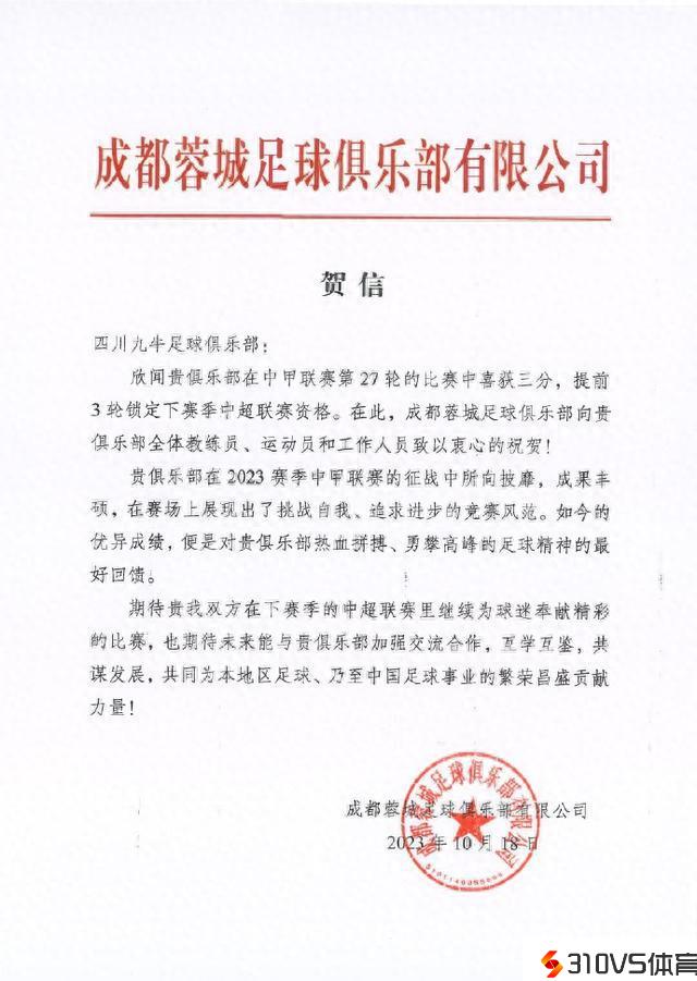 成都蓉城祝贺四川九牛冲超成功:等候明年中超相会