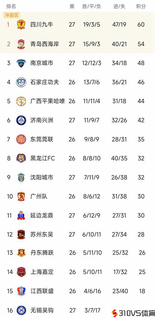 中甲最新积分榜:九牛冲超成功,青岛稳居第二,无锡升级