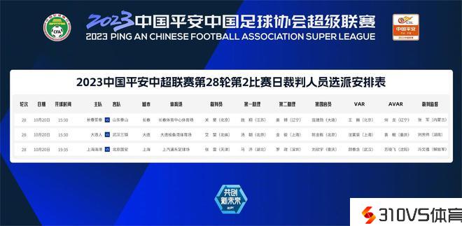 同时开球的另一场竞赛中,长春亚泰将在主场长春体育中心体育场,迎战山东泰山。来自北京的裁判员关星,将担任此役的主裁判;第一助理是来自江苏的国际级助理裁判员施翔,第二助理是来自辽宁的姜博;第四官员是来自大连的寇建勋;视频助理裁判是来自北京的王巍,助理视频助理裁判是来自辽宁的何龙。