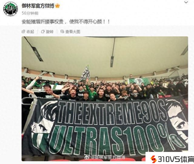 赛后,御林军官博晒出远征球迷的合影并配文写道:“安能摧眉折腰事权贵, 使我不得开心颜!! ”
