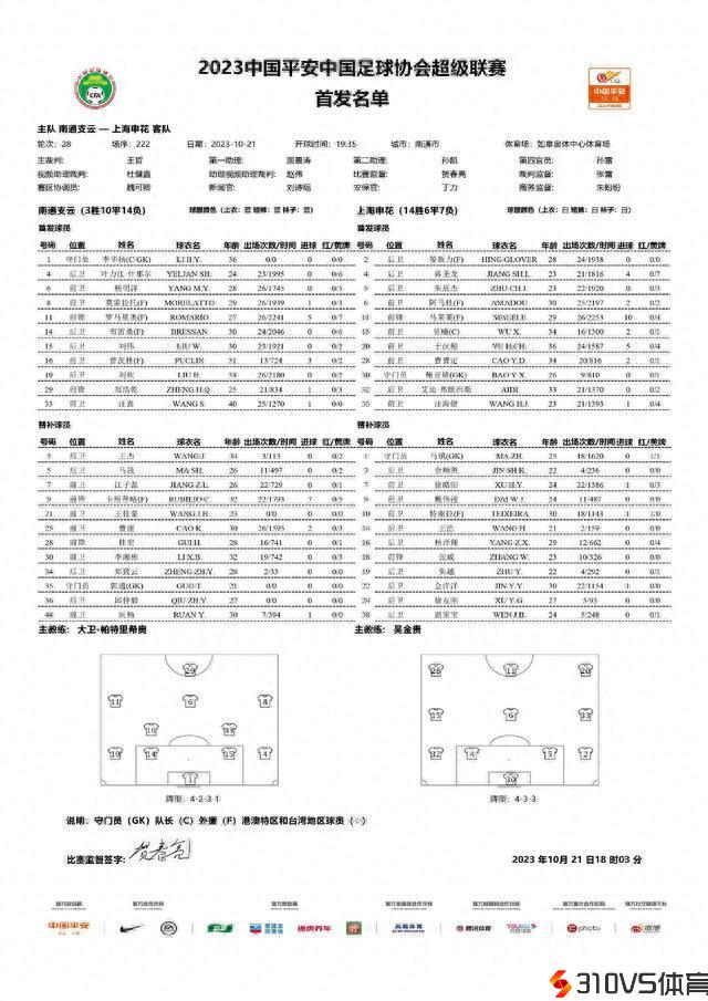 南通vs申花首发:罗马里奥、汪嵩先发,于汉超、鲍亚雄出战