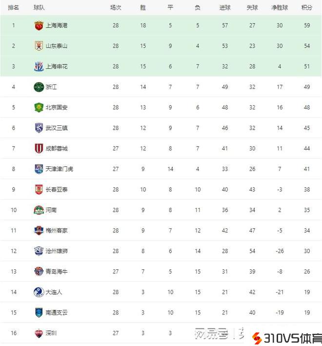 中超最新积分榜:上海申花客胜攀升第3,河南队6球横扫创纪录!