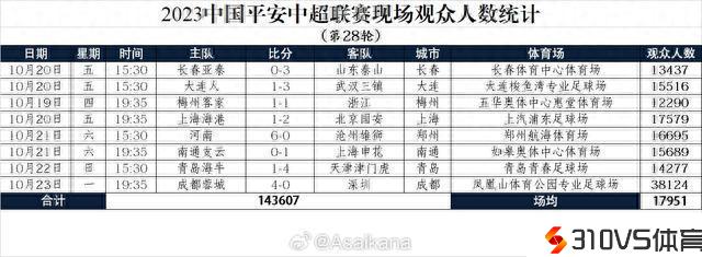 中超第28轮现场观众:成都主场38124人最多,场均17951人