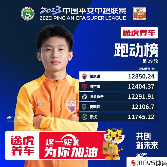中超第29轮跑动榜:胡家进登顶周定洋第二,博桑季奇位列第三
