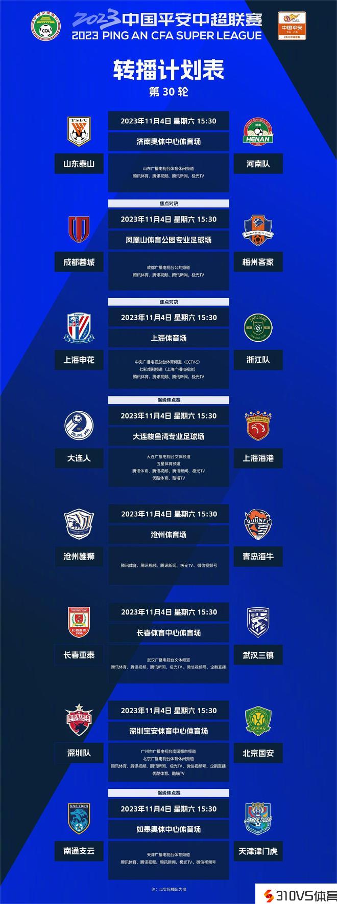 同时停止的上海海港客场对阵大连人的竞赛,将在五星体育频道、大连广播电视台文体频道直播。南通支云主场迎战天津津门虎的竞赛,将在天津广播电视台体育频道停止直播。