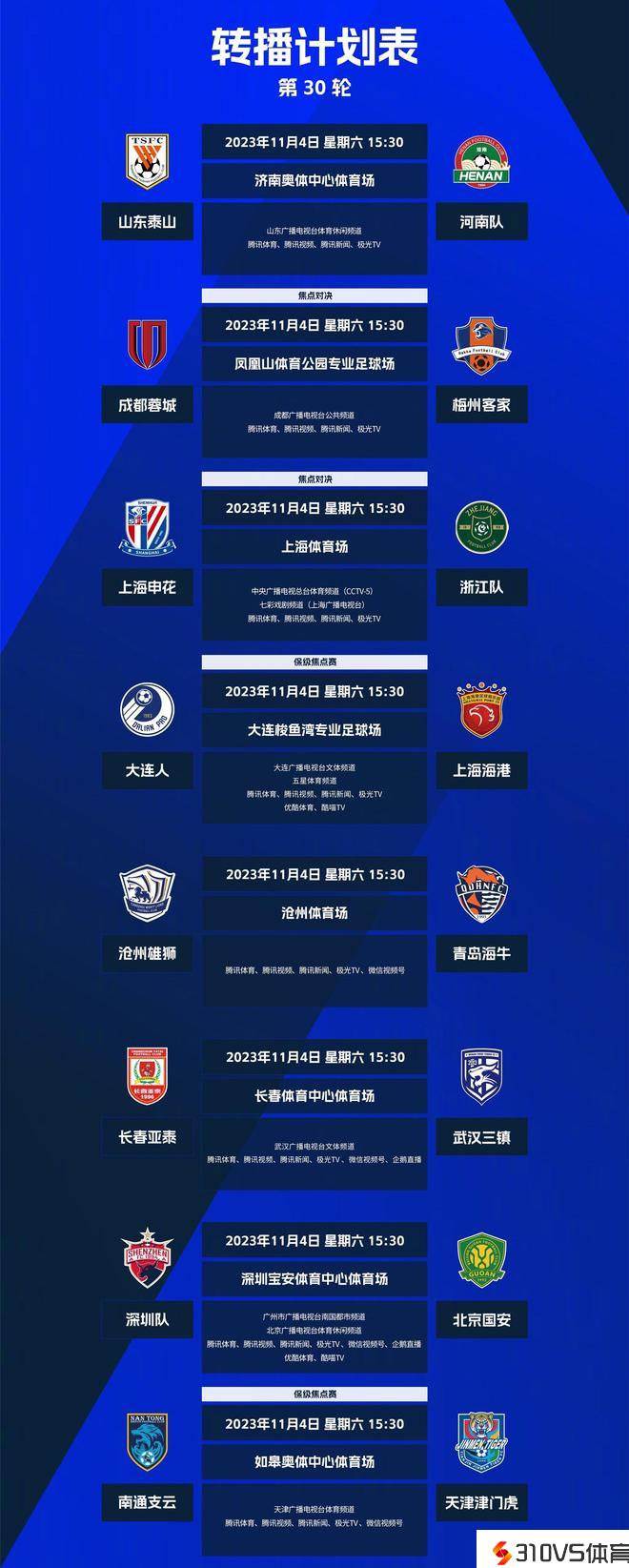 排名第二的山东泰山最后一轮对阵河南队。目前,山东泰山抢先上海申花和浙江队3分,且在胜负关系上优于申花;而在与浙江队胜负关系相反的状况下净胜球多出8个。因此,即使山东泰山末轮无法赢球,只需浙江队无法填平8个净胜球的差距,山东泰山就将以联赛第二的身份取得亚冠精英赛附加赛名额。