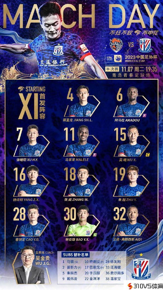 在最后一轮联赛中,申花不敌浙江队无缘下赛季亚冠参赛资历,足协杯是他们参与亚冠的最后希望。首发方面,马莱莱、阿马杜两名外援首发,吴曦、蒋圣龙两名国脚在列。青岛海牛则四外援齐发,誓要在主场拿下申花,闯进足协杯决赛。