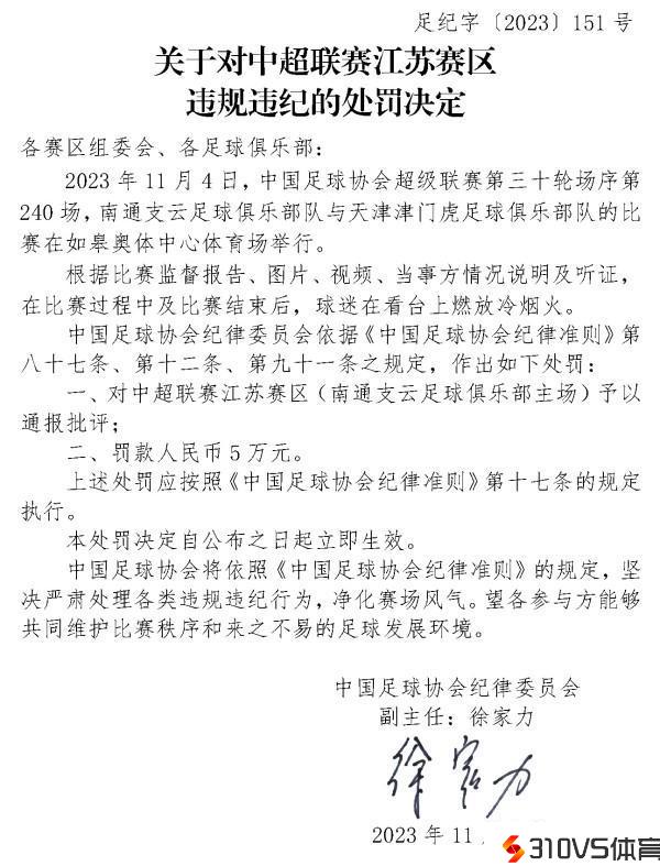 关于对南通支云足球俱乐部违规违纪的处分决议
