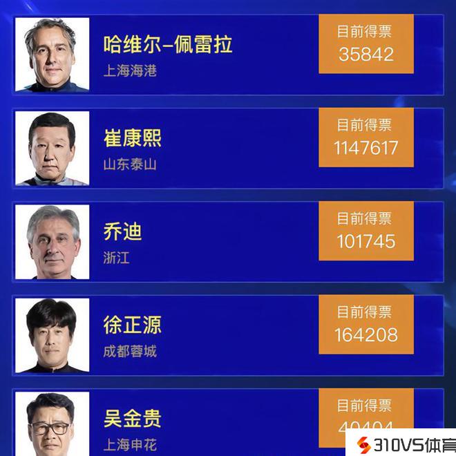 崔康熙得票数为1147617票,得票数第二多的是成都蓉城主教练徐正源,取得164208票,得票数第三多的浙江队主教练乔迪,取得101745票。第四名是上海申花主教练吴金贵,得票40404票,第五名是中超冠军上海海港队主帅哈维尔,得票数为35842票。为啥很多球迷不选哈维尔?就连不少海港球迷都没有投他的票。