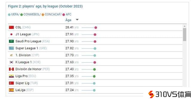 我们两个邻国的联赛球员平均年龄也很大,日本J1联赛以27.91岁仅次于中超排在第二位,韩国K1联赛则排在世界第六位。沙超联赛从往年末尾少量引进高龄球星,其球员平均年龄已涨到了世界第三。另外,平均年龄27.24岁的西甲联赛,是五大联赛中球员年龄最大的。
