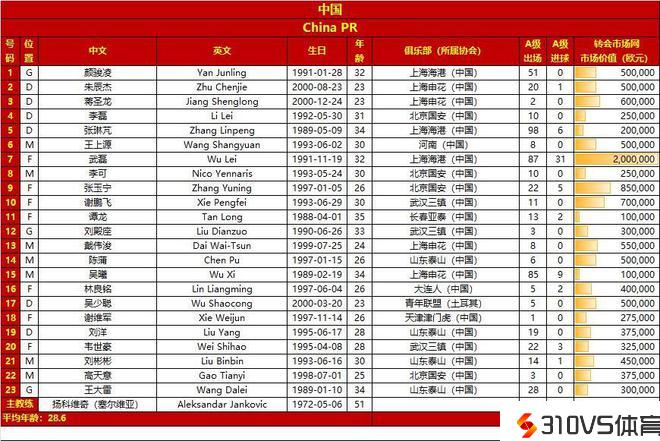 国足战泰国23人名单及号码:武磊7号,张玉宁9号,谢鹏飞10号