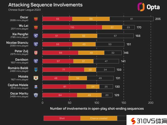 细心看这个数据表,武磊排在第二,有170次参与了上港以射门完毕的进攻。也就是说,上港球员奥斯卡+武磊这两人就参与了上港375次以射门完毕的进攻。这是什么形状?就是一个奥斯卡不时喂饼,武磊不时吐饼或进球的进程。这就难怪武磊为何可以高登射手榜第二了。