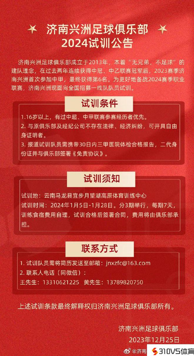 济南兴洲发布试训公告:有过中超、中甲联赛参赛阅历者优先