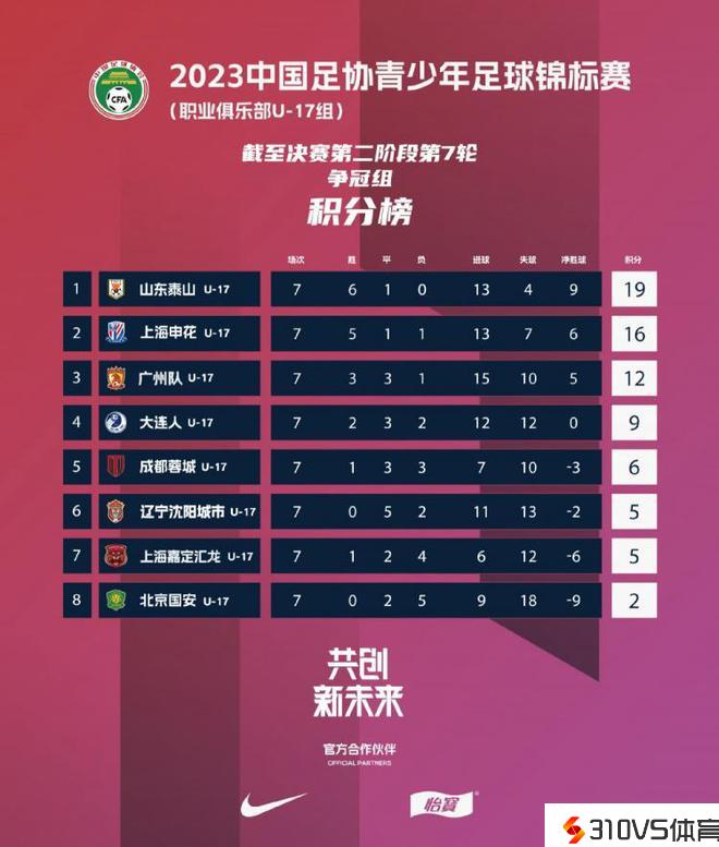 2023赛季U17联赛争冠组:泰山夺冠,申花、广州队排名二三位