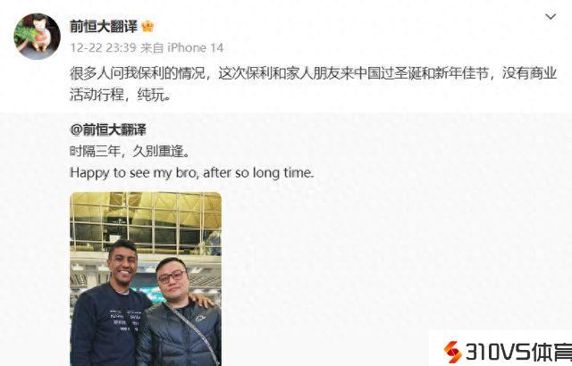 谈到这次回归,翻译前恒大翻译用2个字概括——纯玩(下图)!在团体社交平台上,他写道:“很多人问我保利的状况,这次保利和家人冤家来中国过圣诞和新年佳节,没有商业活动行程,纯玩。”