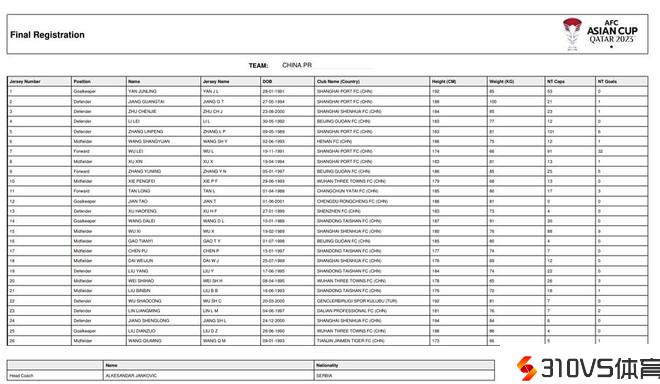 亚足联官网更新国足亚洲杯大名单,泰山队4人在列
