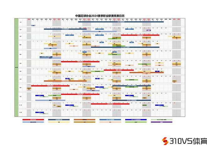 赛历显示,2024赛季首场竞赛为2月25日的超级杯赛,最后一场竞赛为11月23日的足协杯决赛。中超联赛于3月1日开幕,于11月2日完毕;中甲联赛于3月9日开幕,于11月3日完毕;中乙联赛于3月23日开幕,于10月20日完毕;足协杯赛事于3月15日开赛,于11月23日完毕。