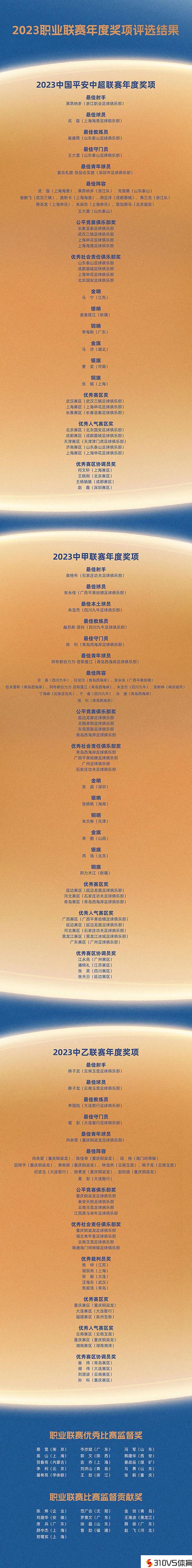 中国足协为惩处在2023职业联赛中表现突出的团体和团体,2023赛季恢复了年度奖项评选活动。依据三级联赛规程和《2023职业联赛各类年度奖项评选方法及实施细则》,在职业联赛各俱乐部、球队、媒体、社会群众的普遍参与下,评选委员会选出2023职业联赛年度各类奖项,详细结果如下: