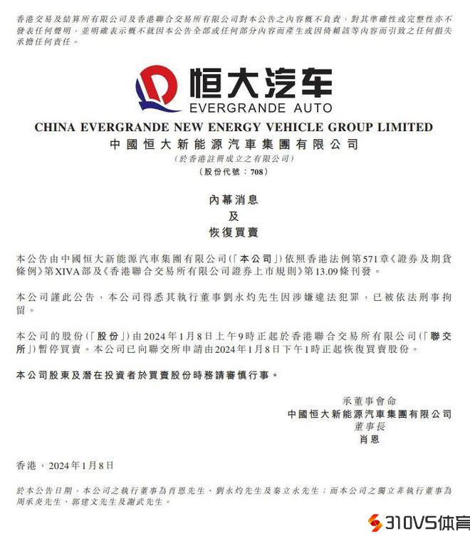 恒大官方发布公告称:明天上午,本公司得知其执行董事刘永灼因涉嫌违法立功,已被依法刑事拘留。本公司已向联交所央求由2024年1月8日下午1时正起恢复买卖股份。