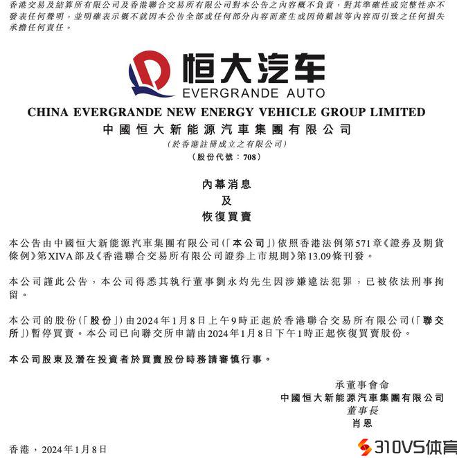 1月8日午间,恒大汽车在港交所公告一则内情音讯称,该公司执行董事刘永灼因涉嫌违法立功,已被依法刑事拘留。
