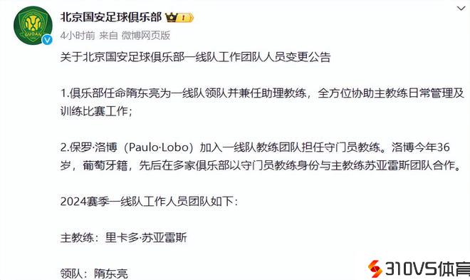 除了引进新援之外,国安还在近期调整了一线队的人事布置。国安俱乐部的官方账号在社交媒体上官宣了这个音讯。该音讯称,担任国安梯队主教练多年的隋东亮将在新赛季担任一线队的领队,并兼任助理教练。
