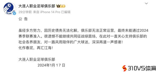 2024年1月17日,大连人职业足球俱乐部宣布中止运营;