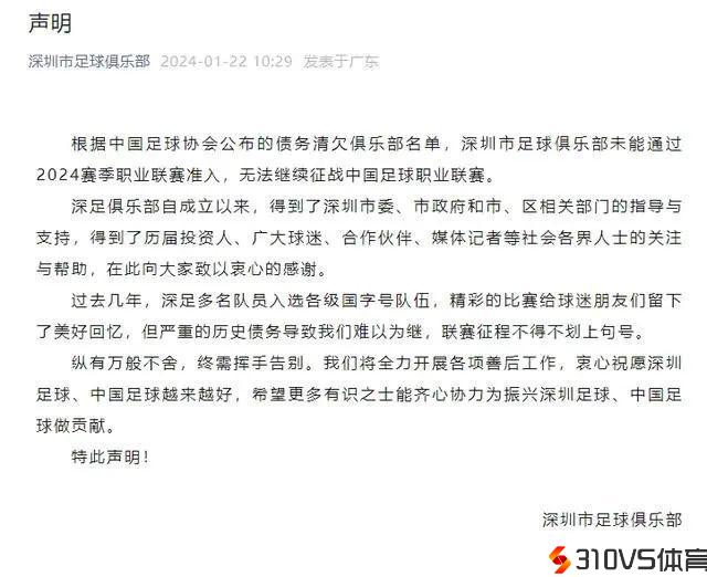 明天,深圳市足球俱乐部发布声明:无法继续征战中国足球职业联赛。