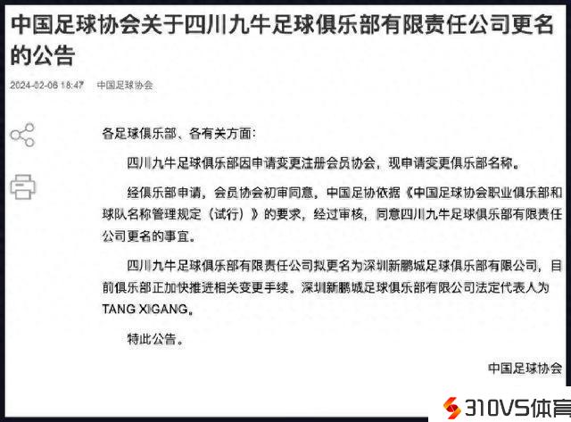 定了!四川九牛更名“深圳新鹏城”征战中超