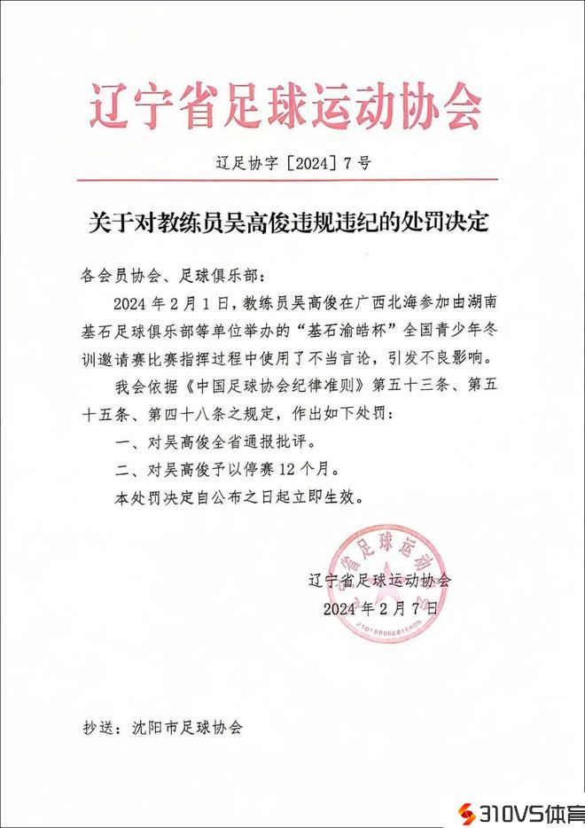 2024年2月1日,教练员吴高俊在广西北海参与由湖南基石足球俱乐部等单位举行的“基石渝皓杯”全国青少年冬训约请赛竞赛指挥进程中运用了不当言论,引发不良影响。辽宁省足球运动协会依据《中国足球协会纪律准绳》第五十三条、第五十五条、第四十八条之规则,对吴高俊全省通报批判,并予以停赛12个月。
