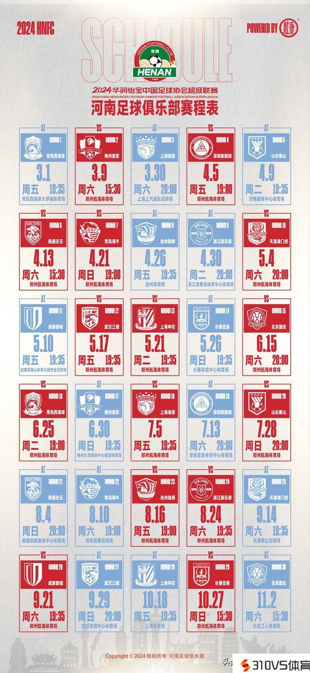 河南队2024赛季完整赛程发布 开幕战对阵升班马