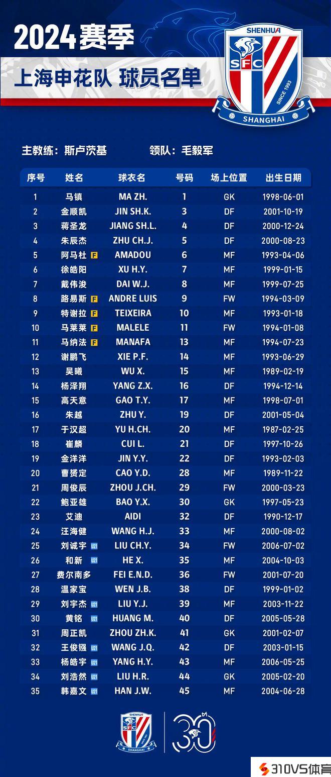 戴伟浚改穿8号!上海申花发布大名单,谢鹏飞披14号,高天意17号