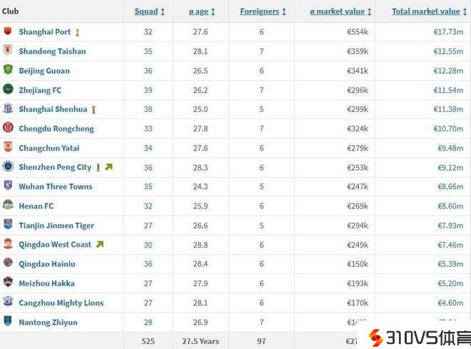 中日韩联赛数据对比:中超平均年龄27.5岁且总身价最低 K1联赛最为年轻