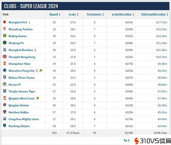 新赛季中超球队身价排行:海港1773万欧第一,南通仅394万欧