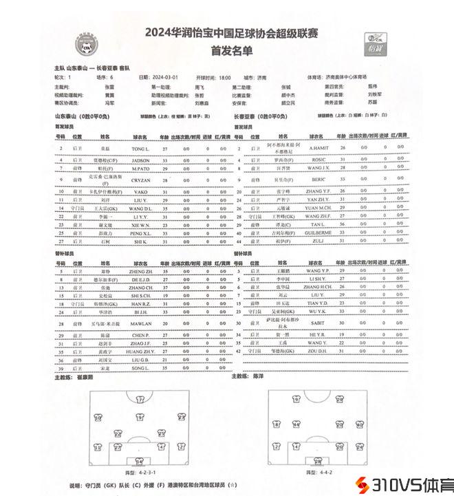 3月1日18:00,中超第一轮,山东泰山队迎战长春亚泰。目前双方首发名单出炉,童磊、卡扎、谢文能、克雷桑首收回战。