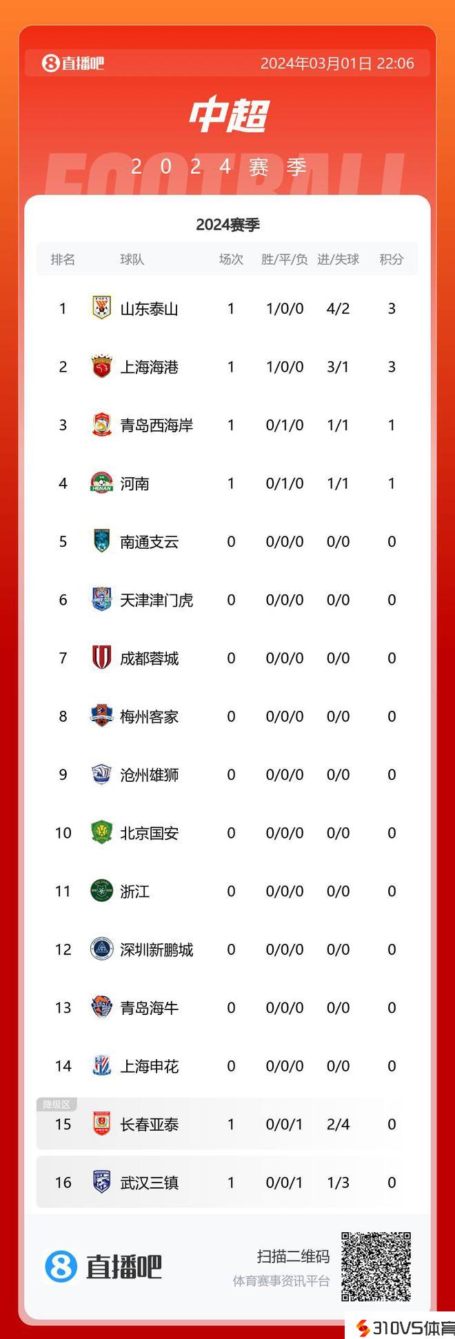 中超积分榜:泰山打入4球居榜首海港第2,河南、西海岸战平排第3