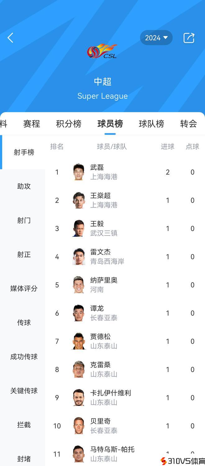 武磊2球登顶中超射手榜,3场竞赛共11人进球⚽