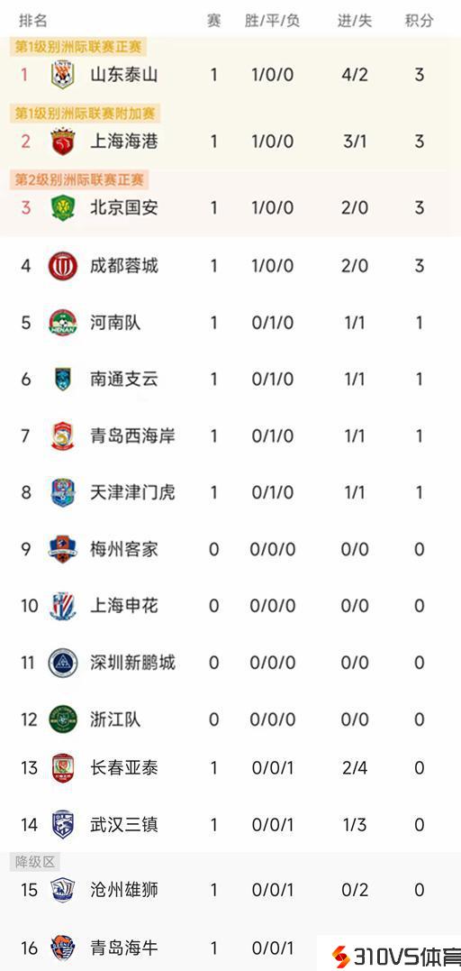 中超最新积分榜:4队开门红,国安成都零封,津门虎1-1南通支云