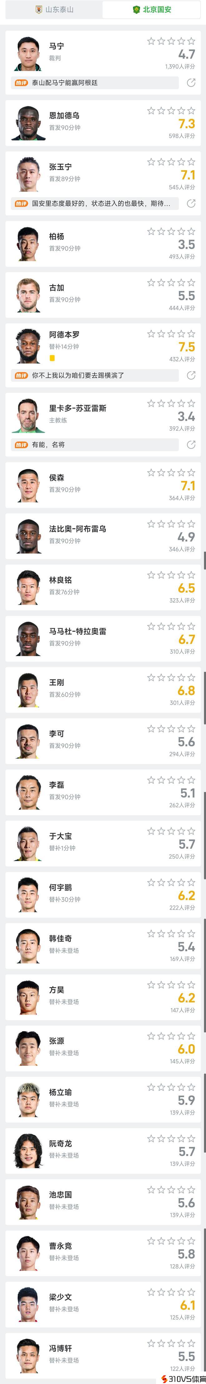 山东vs国安我懂球迷评分:王大雷9.1,阿德本罗7.5,马宁4.7